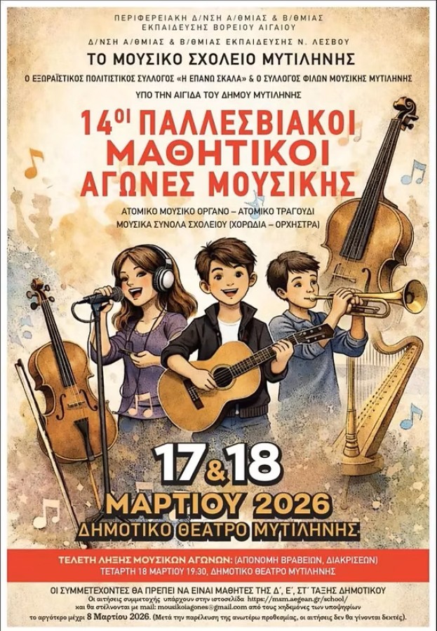 Το Μουσικό Σχολείο Μυτιλήνης ανακοινώνει τη διοργάνωση των 14ων Παλλεσβιακών Αγώνων Μουσικής, που θα πραγματοποιηθούν στις 17 και 18 Μαρτίου, στο Δημοτικό Θέατρο Μυτιλήνης.Οι Παλλεσβιακοί Αγώνες Μουσικής, ένας θεσμός που έχει καθιερωθεί στην τοπική εκπαιδευτική και πολιτιστική ζωή, προσφέρουν στους μαθητές των Δημοτικών Σχολείων την ευκαιρία να εκφράσουν τη δημιουργικότητά τους, να ενισχύσουν την αυτοπεποίθησή τους μέσα από τη μουσική και να συμμετέ...