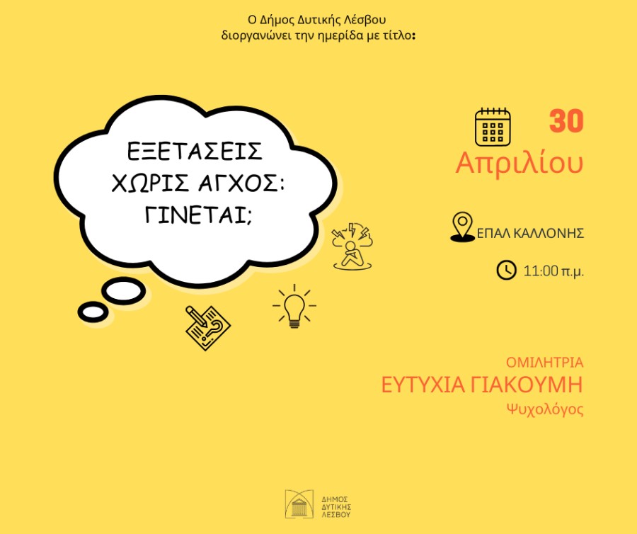 -Με ομιλήτρια την ψυχολόγο Ευτυχία Γιακουμή, η ημερίδα με τίτλο «Εξετάσεις χωρίς άγχος: γίνεται;»,