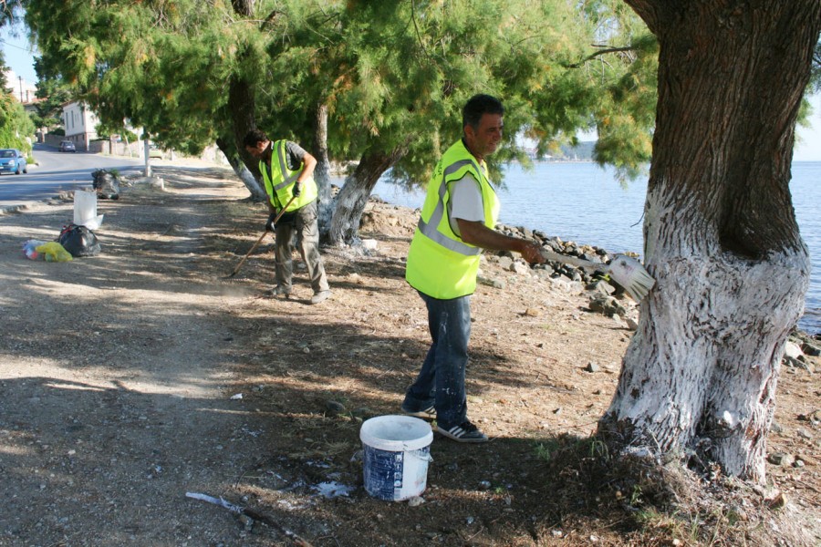 -Το άσπρισμα των κορμών σε δέντρα και αλμυρίκια και με παράλληλο καθαρισμό του περιβάλλοντος χώρου.