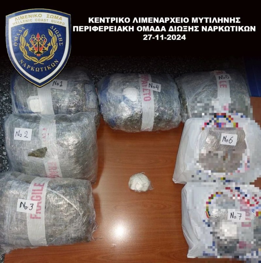 Από τον έλεγχο που πραγματοποιήθηκε από στελέχη της Περιφερειακής Ομάδας Δίωξης Ναρκωτικών του Κεντρικού Λιμεναρχείου Μυτιλήνης, διαπιστώθηκε ότι το χαρτοκιβώτιο περιείχε επτά ανισοβαρείς συσκευασίες χασίς συνολικού μικτού βάρους 7 κιλών και 637 γρ. και μία πλαστική συσκευασία με 96 γρ. κοκαΐνη, ουσίες που κατασχέθηκαν.