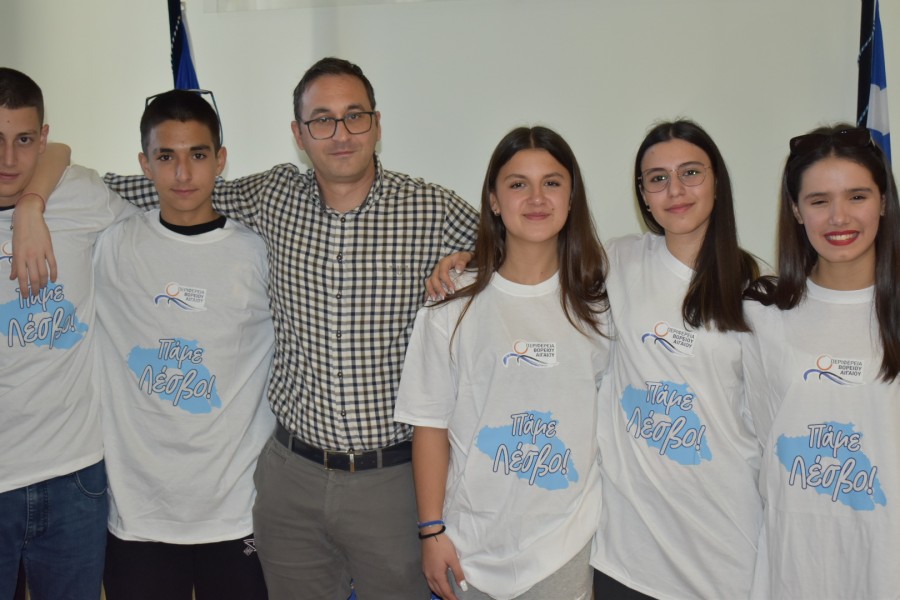 -Παρουσία των στελεχών της Διεύθυνσης Τουρισμού, ο Αντιπεριφερειάρχης καλωσόρισε τους μαθητές, χαρίζοντάς τους αναμνηστικά μπλουζάκια με το σύνθημα «Πάμε Λέσβος»,