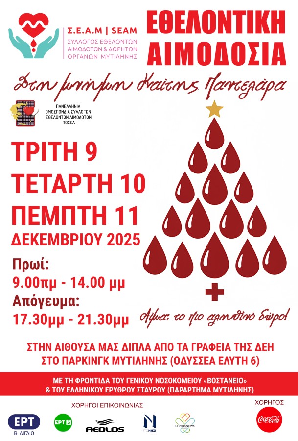 -Ο Σύλλογος Εθελοντών Αιμοδοτών & Δωρητών Οργάνων Σώματος Μυτιλήνης, διοργανώνει 3ήμερη εθελοντική αιμοδοσία