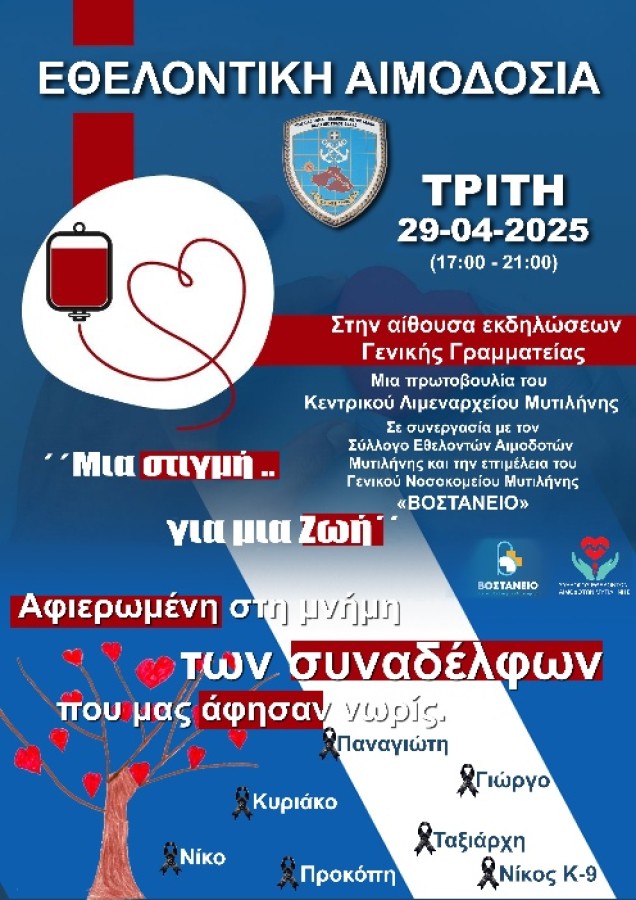 -Η αιμοδοσία τελεί υπό την αιγίδα του Συλλόγου Εθελοντών Αιμοδοτών Μυτιλήνης και με την υποστήριξη του Νοσοκομείου Μυτιλήνης.