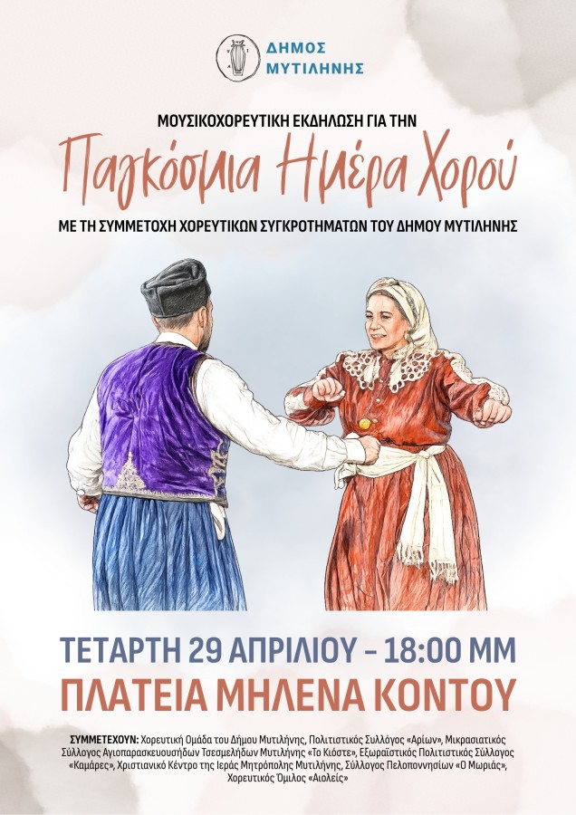 -Εκδήλωση με αφορμή την Παγκόσμια Ημέρα Χορού θα πραγματοποιηθεί αύριο, στην Πλατεία «Μηλένα Κοντού» στο Μακρύ Γιαλό, στις 6 το απόγευμα, από το Δήμο Μυτιλήνης.
