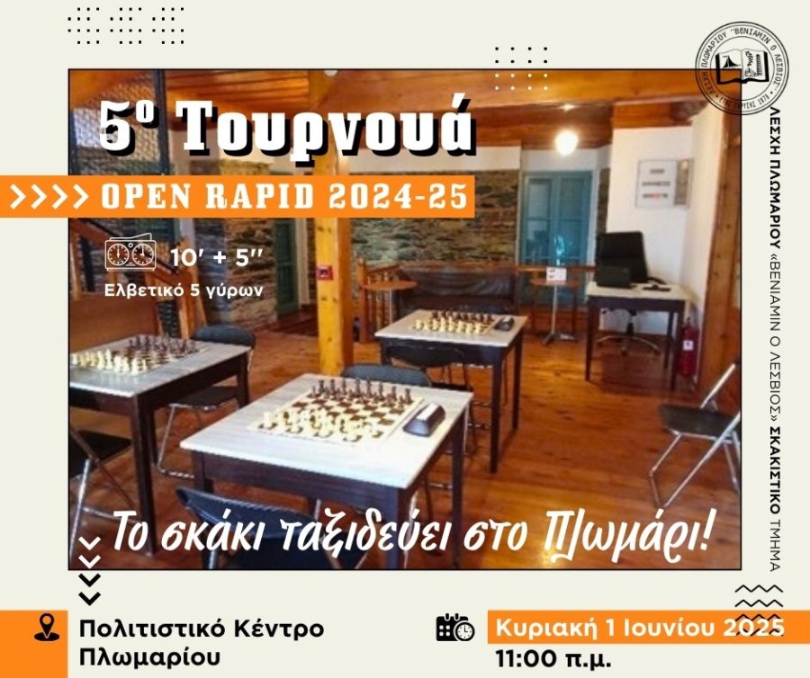 Η Λέσχη Πλωμαρίου Βενιαμίν ο Λέσβιος, στο πλαίσιο της Σκακιστικής εκπαιδευτικής χρονιάς 2023-24 της Ακαδημίας της, διοργανώνει το 10ο Εσωτερικό Σκακιστικό Τουρνουά rapid open Βενιαμίν 2023-24 στο Πολιτιστικό Κέντρο Πλωμαρίου, την Κυριακή 18 τρεχ., στις 10.30 το πρωί. Πρόκειται για σημαντικό Τ...